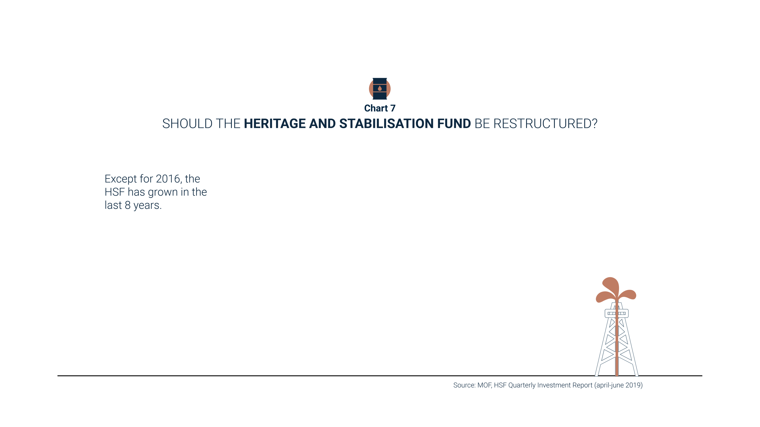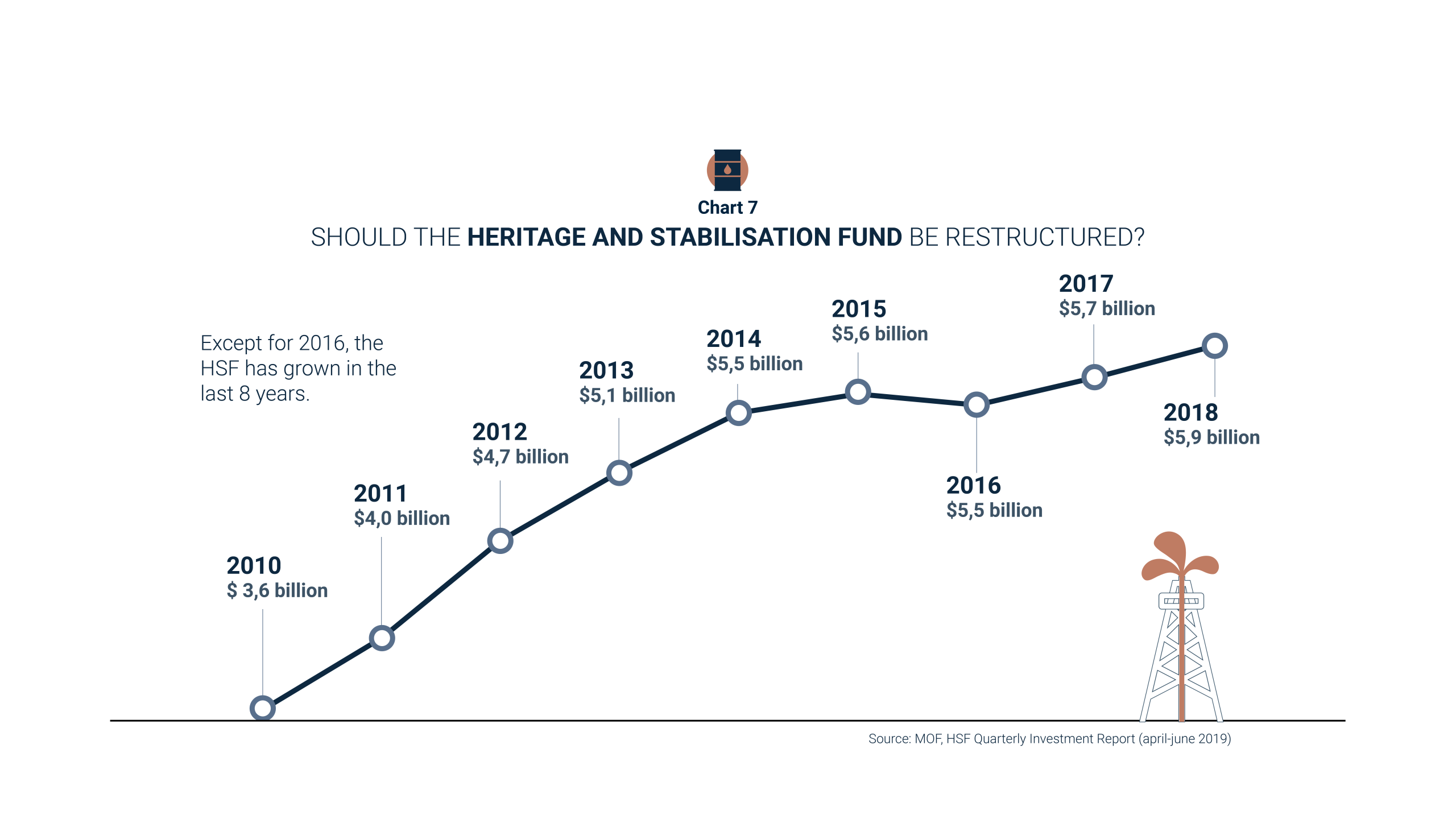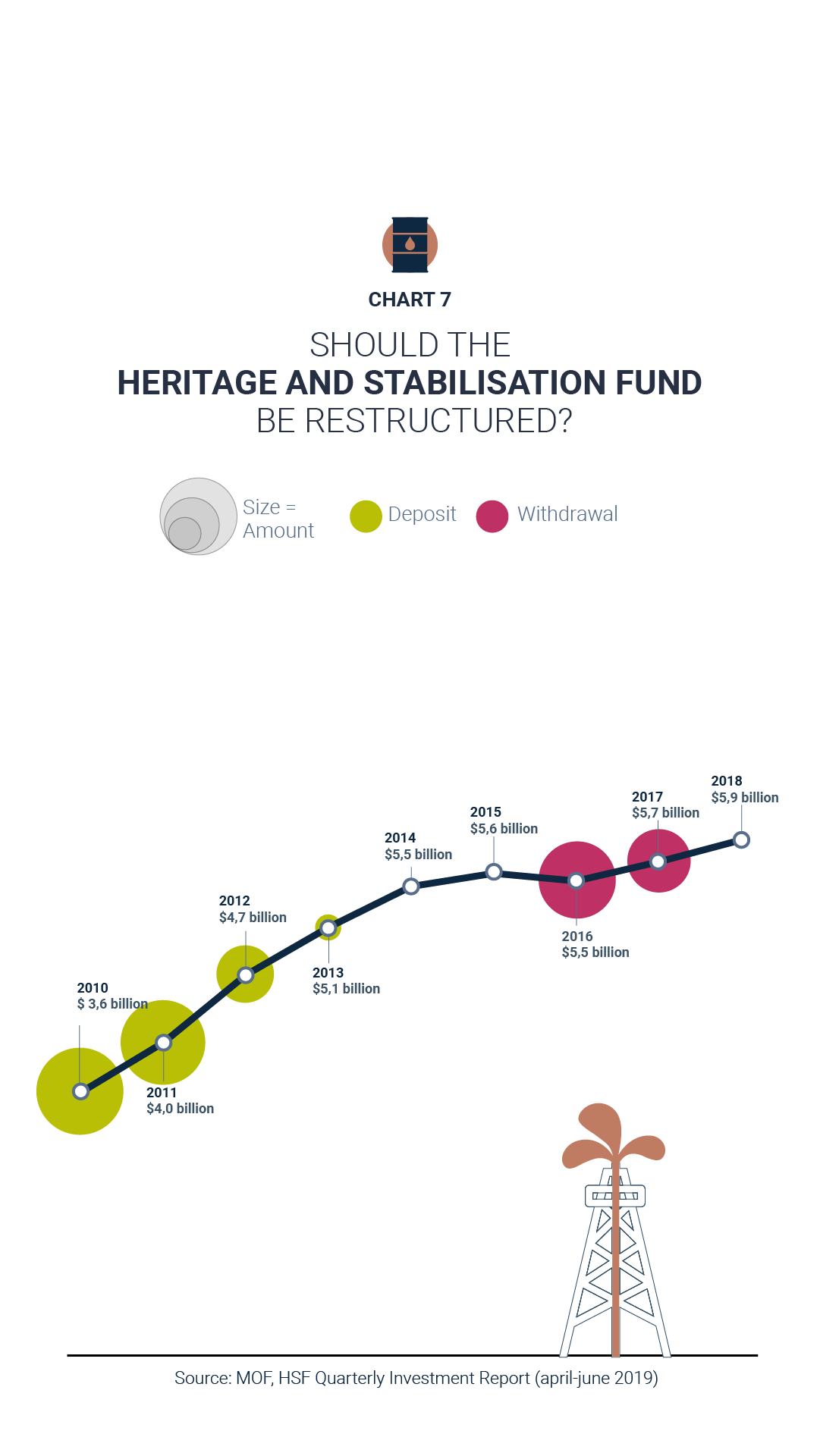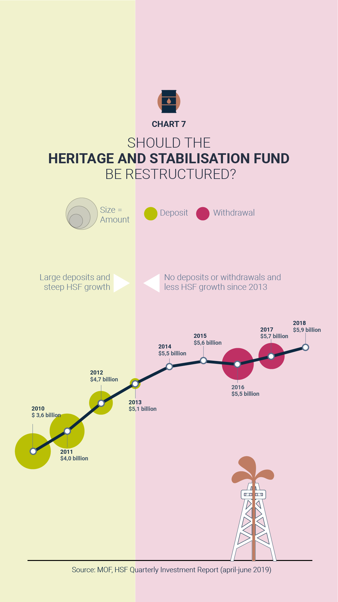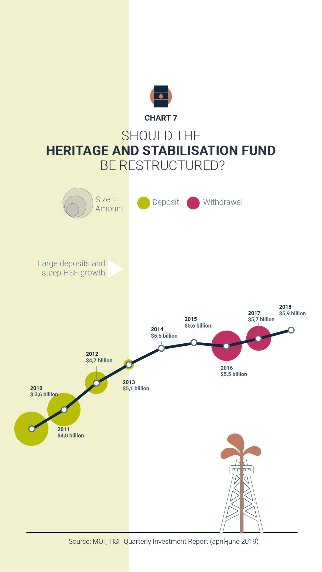 The price of oil averaged US$95 a barrel between 2011 and 2014, a striking recovery from 2010 when it had fallen to US$79.48. Yet the net value of HSF deposits fell sharply, from US$451,400,519 in 2011 to US$42,414,251 in 2013. In 2014, with the price of oil holding steady at over US$93, no deposit was made into the HSF.